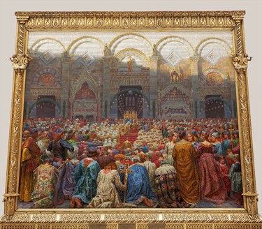 Kristian Zahrtmann (1843-1917), con quest’opera, raffigura tra il 1893 e il 1894 lo svolgimento di un antico rito religioso riguardante l’insediamento del nuovo vescovo nella diocesi locale. Quest’opera è conservata nel museo Bornholms Kunstmuseum a Gudhjem importante località in Danimarca.