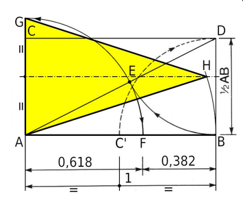 – vi fa seguito il riporto del segmento AE sul lato AB per determinare la relativa divisione con il segmento AF ed FB che sono in rapporto aureo;
