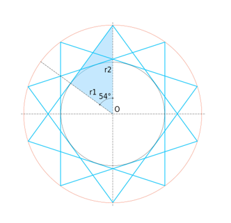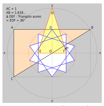 Sarà il raggio OG, del cerchio tangente al lato AB del triangolo rettangolo aureo ABC, a costituire il cerchio esterno di un poligono stellato regolare che sarà il decagramma. Inoltre sarà il cerchio di raggio OH, tangente ai lati obliqui del triangolo isoscele DEF, a costituire il diametro interno del sudetto poligono stellato che ora andremo a disegnare.
