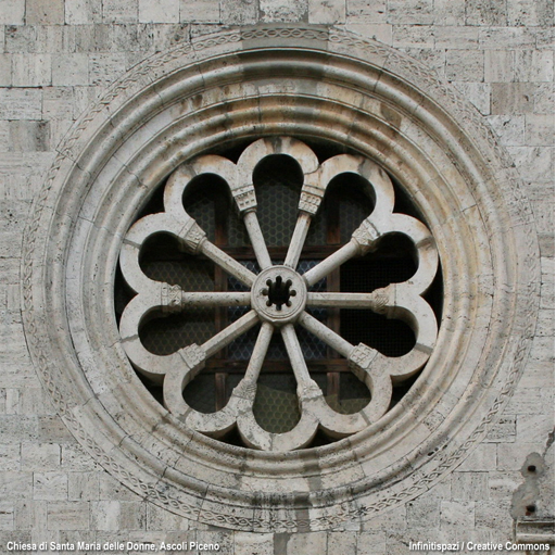Si sarà capito, a conclusione della parte geometrica, che il triangolo rettangolo aureo rappresenta la gallina o la colomba e che, il triangolo isoscele aureo rappresenta il gallo o il colombo. In quanto all’astro del decagramma, non è altro, come già fatto capire in precedenza, che il risultato della fase conclusiva dell’Opera alchemica, cioè quella dell’ultima moltiplicazione per far brillare lo splendore del Sole. E questo grazie al “color di gallina” argomentato nel capitolo inziale, un certo fuoco detto anche “fuoco di ruota“, il cui emblema lo vediamo rappresentato con i rosoni delle cattedrali gotiche e romaniche. La fig. che segue mostra un Rosone a dieci raggi e lo vediamo espresso all’entrata della Chiesa di Santa Maria delle Donne di Ascoli Piceno.