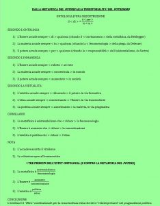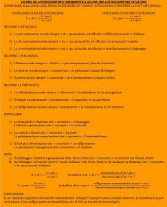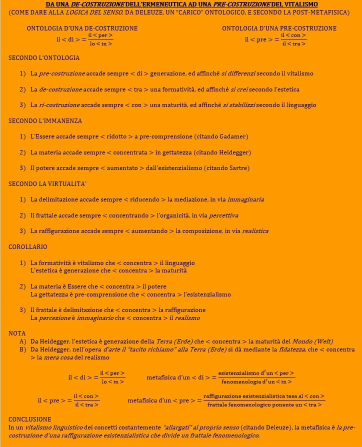 Heidegger assegnava alla decostruzione il compito d’una ricerca, contro la tradizione occidentale. Qualcosa che criticasse le pre-comprensioni sottese ai principi supremi della metafisica. Poi, Derrida interpreta la decostruzione in modo probabilmente più “nichilistico”. Egli accetta la situazione esistenziale per cui ogni uomo rimane costretto a “dimenticare” l’Essere, mediante la riflessione concettuale. Ma basterà il continuare la decostruzione della storia metafisica? Oppure, si rischierà paradossalmente il ritorno alla razionalizzazione sul realismo? Meglio ci pare lo “spostare” lievemente la decostruzione di Derrida: non verso una ricostruzione della… decostruzione, bensì verso una pre-costruzione… costantemente in decostruzione. La classica pre-comprensione che “riduce” l’Essere (in via metafisica) abbisognerà d’una formatività estetica. Tale fenomenologia aiuterà la decostruzione a porsi dentro un Destino nel quale ogni concetto resta alla continua generazione di sé. L’arte e più in generale la creatività sono formative. Vale il campo “lievemente” interpretativo d’una pre-costruzione. Deleuze insegna, tramite la logica del senso, che i nostri concetti sempre “s’allargano” in se stessi[13]. Qualcosa da percepire dentro una verbalità che “si ri-generi”, nelle sue differenziazioni. Il “filtro” dell’estet-ontologia ci aiuta ad intendere la pre-costruzione per cui i singoli concetti sempre “s’allargano” al senso. Vi funzionerebbe una sorta di nichilismo positivamente formativo. Sarà evitato il paradosso di ricostruire (anche per idealismo) il “mero realismo” sul decostruito. Il prefisso del < pre >, insomma, si farà percepire al “parto concettuale” infinitamente generativo d’un ontologismo.