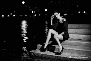 According to Breton, lyrically the loved woman has the arms in the same time of foam and sluice gate. The beauty is able to harmonize the buxomness on the slenderness. So, even the salt water would help the life, while the mill, with its blades, will allow a “jumble falsely impure”, of the ground wheat, to fluctuate. Angie was framed for a shot in black and white. She poses sitting on the steps of an entry to the water: who knows if fresh or salt. We like imagining the configuration “in a mill” of the limbs, which have a propulsion by the blades. The staircase could turn (with the complicity of the framing in photography). Something which will virtually start a “grinding” of the waves. Perhaps, finally, a “little plant” as firework will rise, and perfectly from the projection of the left arm, whose hand, having the fingers for “a mooring” of the face, would induce the thought to seize a right “pinch of magic”, for the beauty of the life. Here we perceive much more a foam, compared to a sluice gate.