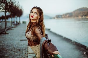 According to Antonio Colinas, we can both stay afloat left and right on the waves that flow as a lost oar, and follow as the dolphins a direction “condemned” by the time. The man will never exit from his finitude: neither knowing how to adapt himself, nor reassured from an automatism. Annette would have been framed on the lakefront. The top tied at the neck has a design with the waves, which increase the sensuality, already given by the transparency. The torsion of the body (in a pose more in profile than in ¾) would jerk between the water and the land. A lake is always pleasant in its perception, without requesting an excessive care for the breakwater. The left arm aims to us, and like an oar. Also in the security of a coast, the support of somebody will be needed. There is the detail of a leather jacket: this one would mediate between the woodiness (temporal) and the liquidness (situational).