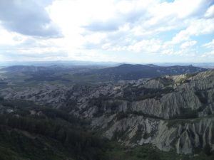 Simbolicamente, la fredda sera d’autunno si raccoglie in un gomito inerte. Ne deriva che la linfa scorrerà ai “meri tonfi” (verso la “desertificazione” della vecchiaia). La secchezza delle rughe si può accompagnare alla gobba per l’osteoporosi. In autunno, al massimo il gomito si ridesterà nelle castagne “scoppiettanti” (già alla caduta dall’albero, oltre che al fuoco per la caldarrosta). Il turismo potrà aiutare a superare la malinconia per i villaggi isolati che si spopolano, coi giovani in cerca d’un lavoro. Oppure è il “gomito” del calanco a cedere: si pensi a Craco. Di certo subentrano i problemi cari agli ecologisti. Nell’epoca moderna, con la corsa al successo ed al profitto, si contraddice la “poesia ingentilita” per il flusso di torbida, dalla geologia. Il sollevamento delle Dolomiti Lucane fu lentissimo, oltre che (ovviamente) naturale. Una produzione seriale risulta accurata nella sua divisione del lavoro. Ciononostante serve aggiornare, a monte, la creatività del designer. Agli inizi del Duemila, lo stabilimento della FIAT a Melfi garantiva un giro d’affari di livello mondiale. Terry Tempest Williams immagina un archeologo di Boulder, che riesca a seppellire poesie nel deserto. E’ una citazione interessante, provando ad allacciare i calanchi lucani alle badlands nordamericane: