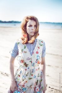 Alessandro Canfora scrive che in un quadro di Van Gogh la rosa sarebbe rozza solamente per via dei petali dorati, in arrivo dalla pressione delle onde marine. Trattasi d’una sinestesia fra la poesia e la pittura. Forse l’impressionismo più iconico rimane quello della luce sull’acqua. Noemie posa sulla spiaggia deserta. Il forte vento quasi le conferirebbe un “cappuccio di capelli”. L’abbigliamento riproduce l’ambiente marino: fra le righe ondulate al biancoblu (d’un impressionismo “ipnotizzante”), e l’avorio della sabbia, dal quale tuttavia crescerebbero i fiori, oltre l’arenarsi delle conchiglie (d’un surrealismo astratto). Immaginiamo che la testa possa perdere i “petali” dei capelli, lungo il collo, a causa del forte vento. Oppure si tratterà d’una pedaliera, per un volto che, messa così, si percepirà prettamente accelerato nel suo espressionismo.
