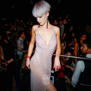 According to Sonja Smolec, lyrically a rare pearl in the palm of the hand would anticipate the embrace, while the heart would be a pink shell, having the slats like a bench covered by a lilac (with the “sugared” blue of the waves, between the leaves). Overall the ecstasy of the sprouting would be important, to symbolize the human love. Giulia posed in a cow-boy shot, presumably dancing at the disco. She has a transparent dress, that we perceive with very fine sequins, and for a tone more lilac than silver. Behind the body, there is the parapet of a stair set. Also this element has the transparency: of the glass or however plasticized. We imagine that the earrings “in a small bell” dictate an ecstatic tempo to the psychedelic lights, and on the “keys” for the veins “as flutes” (flowing through the thin straps). If the music was undulating, so the swing of the hips in Giulia would become floating, aesthetically.