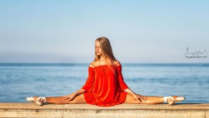 According to David Harsent, lyrically a glove or a cockade in the stalls would have “buffered” the undertow with its ticking against the boats. Overall, we will have to celebrate the elegance of the missing moments. Perhaps, if the action always entails a reaction, so we will mature accepting the ˂ we tried ˃. Nicole poses as a dancer, with the legs opened and stretched, doing the splits. She is seated on the small wall of the seafront. The red dress is perceived gathering “a cockade”, from the shoulders to the thighs. On the background, the sea is out of focus. We can imagine that in this case the dance compensates for the swimming, preserving there however the flourishing. But how much will the shoes allow a tap dance for the waves, with equal whiteness? A dancer on the sea would exist: the siren.
