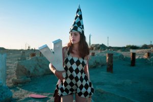 Interpretando Romano Battaglia, bisognerebbe che noi sorridessimo al nostro destino, avendo vissuto in un carnevale di maschere toglibili, se l’illusione sarà stata capace di danzare fino al punto da captare, una volta per tutte, la fiducia di qualcuno (e per l’amore reciproco). La regista Susanna appare inquadrata in una delle sue sinergie di lavoro. Lei posa da figurante carnevalesco, indossando i rombi bianconeri. Susanna ci spiega d’aver scritturato una ballerina meccanicamente perfetta, a tal punto da non arrendersi al suo abbandono fra gli scarti. Il progetto s’intitola Wasteplanet, ed è ambientato nel villaggio di Bombay Beach, negli USA, dove una comunità di artisti s’autogestisce amorevolmente, da anni. Contro la produzione industriale (la quale cede nell’accettare e favorire il consumismo), l’estetica rivendicherà la propria aura (da Walter Benjamin). Addirittura il deserto (intorno a Bombay Beach) avrà favorevolmente il miraggio “risorto” sul ricetrasmettitore (necessario per uscire dall’isolamento), grazie al cappello a cono, mentre il vicino lago (il Salton Sea) potrà depurarsi dai veleni, “elasticizzandosi” con la danza d’un atollo (dal modulo a ˂ lettera Y ˃ che Susanna regge, sul braccio destro). Peraltro qui l’espressione del viso si percepisce seria, e chissà se con una vena di malinconia… L’arte è destinata a lottare continuamente contro la mercificazione!