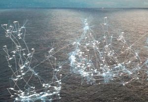 A Venezia, la parete con le “caselle” si percepirebbe grazie ad una battaglia navale. Ma forse questa sarebbe coordinata dalla bioluminescenza dei pesci abissali… Senza scomodare la psicanalisi, la tecnologia moderna tende sempre di più all’immaginario. In mare s’alzano le piattaforme, per intercettare il getto del petrolio. Navigando nel web, ciascuna “luce” dell’intuizione (dal click) ha “l’ombra spugnosa” dell’indicizzazione. Si rischia sempre il farsi tracciare. C’è l’occhio mirato del Grande Fratello, senza il “bulbo” per la piattaforma del 3D (dove il nostro controllo perfino passa dall’oscillazione incerta al coinvolgimento appagante). Quest’ultima pare davvero “cantieristica”, nella tecnologia contemporanea. La battaglia navale esposta dall’artista non subisce fortunatamente l’urto esplosivo. Come per il 3D, si tratta di conferire un vissuto all’immaginario. In passato, i marinai s’inventarono il gingillo al design della nave in bottiglia. Oltre l’onda indefinita del naufragio, esisteva il sorso per lo scampato pericolo! La tecnologia potenzia sempre di più la messaggistica. La nave, che prima passava a fatica dal collo d’una bottiglia, oggi è “sgattaiolante” nel collo, senza ingombro, del 3D. La scia dell’emoticon funge prettamente da “trolley” per lo smartphone. La messaggistica di base avrà la “cantieristica” del coinvolgimento personalizzato. In accordo con la psicanalisi, le installazioni di Matthew Attard paiono percepibili ad “ecoscandaglio” per il benessere, da una luce freddamente bianca che “smusserebbe” (fra il “sale” dei cardini a pixel), al veleggiamento, la punta dell’iceberg per i problemi sociali. C’è un’etica anche per l’intelligenza artificiale, innanzi ai cambiamenti climatici. L’iceberg si sposta nel mare per l’inquietudine delle navi. Lì l’intelligenza artificiale traccerà una “vela”, ad esempio da una statistica sui venti. I problemi ovviamente passano dal livello personale a quello sociale. Lo scioglimento delle banchise ai poli disabitati contribuisce all’innalzamento dei mari per le città costiere. Pare che Matthew Attard cerchi esteticamente una “cristalloterapia” per la primordialità dell’acqua (senza la quale nessuno potrebbe vivere). Ricorrendo alle navi s’iniziò a diffondere la cultura umana, dagli scambi fra le civiltà. L’onda si percepiva preziosa alla vista come un cristallo sulla pelle (sopportando con questo pure la pesantezza, alla miniatura per l’abisso). Il 3D è alla portata di tutti, per il progressismo sociale. In quello, la cristallizzazione può rimodellarsi.