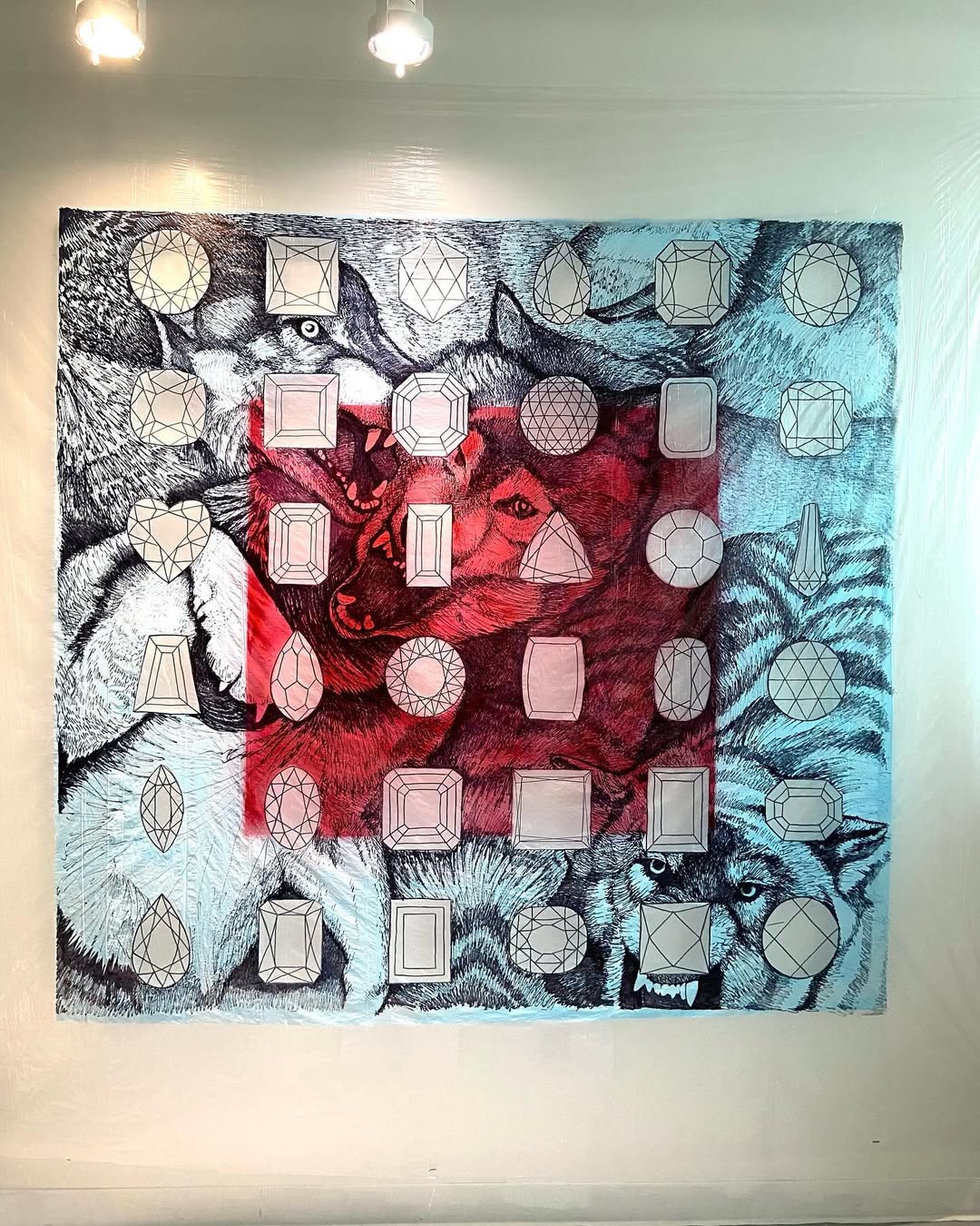Nell’opera dal titolo A gemstone diagram, a pack of wolves, and the colors of Kurt Cobain’s guitar, dialetticamente si percepirà la morbidezza della durezza. L’intarsio dell’influenza astrale tramuterà in libidine ancestrale, per la psicanalisi. Il telo si squadra, quasi a confezionare un CD. Il disegno si percepisce metallaro o grunge, fra le borchie delle gemme e le frange delle pelli. Per difendersi dagli impulsi carnali, all’osservatore altro non resterà che squadrare la bocca famelica del lupo cattivo, complice la tonalità del rosso. I mobiles di Alexander Calder s’allaccerebbero ai diagrammi da Piet Mondrian (i quali, più commercialmente, servono a tagliare le pietre preziose). Al vitalismo conta la trasparenza delle nervature, affinché si goda tramite la psichedelia. La gemma ci piace a prescindere, sebbene essa sia tagliente. La bellezza dovrà mettere un “sarcofago” protettivo sull’esplosione d’un incubo. Il rosso rievoca una chitarra di Kurt Cobain, e chissà se in aggiunta la copertina col “cagnaccio” del poliziotto, dall’album King for a day… fool for a lifetime dei Faith No More. L’ambivalenza d’una trasparenza grigio-celeste (tanto serena quanto ghiacciata) comporta che si plastifichi un esorcismo sul Sandman, dai Metallica. Se la mente che razionalizza si dotasse d’un sacco a pelo, mediante il perturbante inconscio, allora la “gemma” dell’ispirazione morderebbe una “fredda scheletrizzazione” sul concettualismo.
