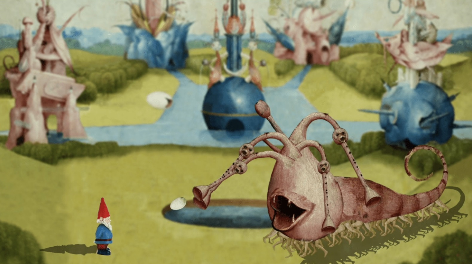 Tecnicamente, oggi noi riusciremmo a progettare alcuni aquiloni che, dal cielo, servissero a trainare una giostra in terra, e per produrre l’energia rinnovabile. Non è fantascienza, considerata la nostra esperienza con gli sport acquatici. Il < kitesurfing > sfrutta il principio fisico della forza generata da una differenza di pressione, e parimenti all’ala d’un aeroplano. L’atleta può fare salti o capriole, divertendosi con le sue “coreografie”. Oggi l’Intelligenza Artificiale si percepisce energicamente da una sorta di cervello rinnovabile. In passato, c’era comunque la fantasia antropomorfica dei folletti. A quelli l’uomo avrebbe potuto chiedere la realizzazione d’un desiderio privato. Nel video animato di Ron Laboray, si contesta la facilità con cui lo straniero è emarginato, o peggio attaccato. Però anche lui ha una sua “storia”, da raccontare per comprensione reciproca, alla fine distogliendoci dalla vacuità dell’interesse privato. Lo gnomo disegnato da Ron Laboray traina in cielo il millepiedi, come un aquilone. Non ci sarà il realismo dell’energia rinnovabile, rimpiazzata dal surrealismo d’una magia saggia. Possiamo comparare il folletto ad un aquilone, quantomeno tra le foglie. Oggi è saggio, secondo l’ambientalismo, che si ricorra alle energie rinnovabili. Immaginiamo che l’artista abbia raffigurato, alla sintesi dialettica fra lo gnomo ed il millepiedi, una zampogna dove sarebbe la musica ad arricchire la cornucopia. Così l’individualismo del capitale cede al comunitarismo della generosità. La musica non è mai possedibile; quella psichedelica per Ron Laboray può distorcersi all’animazione. Si dà più verità nel surrealismo, rispetto alla plastificazione del capitalismo.