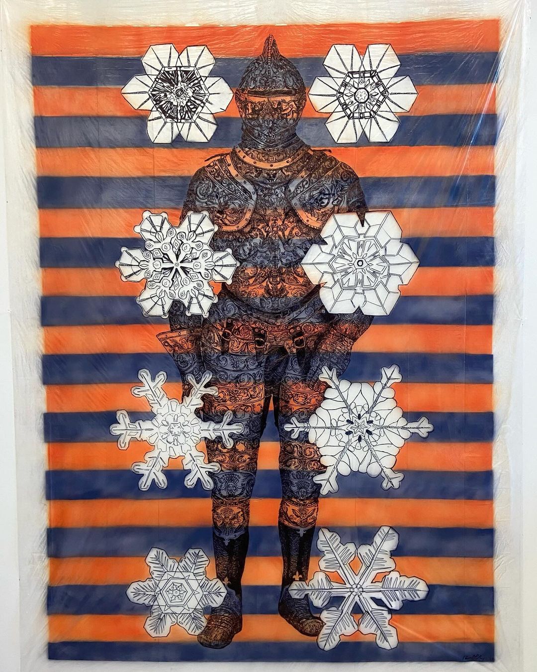 Nell’opera dal titolo The first photographed snowflakes, the armor of a French King and Syd Barrett’s floor, ci piace immaginare che l’artista ironizzi sulla bandiera a stelle e strisce, per la superpotenza degli USA. Lo scudo del re belligerante si percepirebbe al limbo d’una tastiera. C’è la cristallizzazione sui fiocchi di neve, avente una preziosità lattiginosa (complice la plastificazione) che vanificherebbe quella dell’oro, non corruttibile. Inutilmente si combatterà per aprire una cassaforte… Mancheranno tutti i preziosi! Né regnerà l’uomo, bensì il destino: al calcolo dei semi, per le carte da gioco. Syd Barrett, all’impeto d’una psichedelia, dipinse a righe arancio-blu un pavimento. Fra l’alba ed il tramonto, più che il giorno si dovrebbe mettere la sera: la vita aumenta di “peso”, laddove la maturità accompagna l’invecchiamento. Una catapulta a palle di neve sarebbe ironicamente innocua, per il soldato medievale. La corazza disegnata da Ron Laboray si percepirebbe più putrefatta che arrugginita: dagli intarsi delle libidini, in psicanalisi. Le doghe del letto per legare il corpo, impedendogli l’aggressività, al massimo scivolerebbero sull’ipnosi. Sembra che sia stato esposto il logo per uno skipass medievale, nelle Alpi. Al moderno consumismo piace il cosmopolitismo, partendo dal turismo, in una dialettica fra la globalizzazione e la glocalizzazione.