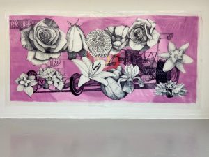 Nell’opera dal titolo The flowers of G12, Shirley Muldowney’s first win and the colors of the Pink Panther, s’ironizza sulla plastificazione della ricchezza. Nella modernità, è il petrolio che sporca le banconote. Questo parrebbe più trasparente, quantunque senza mai pulirsi, nella postmodernità delle criptovalute. Diversamente, Ron Laboray s’augurerebbe un’evoluzione a ritroso: soltanto della Natura. Ci stanno dodici fiori, a simboleggiare i principali Paesi che governano l’industrializzazione mondiale, tramite i finanziamenti delle banche. La loro composizione si percepirebbe all’ingrandimento d’un bikini. La pelle avrà il rosa a “sbocciare” verso il viola. Ricordiamoci la controcultura per i figli dei fiori, negli anni ’70. Le banche sono capaci di passare dai monopoli alle… monotonie, giacché esse si cautelano razionalisticamente dagli investimenti troppo arrischiati. L’adrenalina apparterrà beffardamente al ladro del diamante nella teca (la Pantera Rosa), oppure civilmente al femminismo automobilistico, grazie a Shirley Muldowney. Lei nel 1984 miracolosamente sopravvisse ad un tremendo incidente di gara. Il petrodollaro diventa rischioso per il pilota automobilistico… Spesso s’utilizzano le barriere di sicurezza coi pneumatici avvolti da un telo. Il dragster fornisce le prestazioni più alte per l’indicatore dell’accelerazione; i ladri le sintetizzerebbero al < filiamo >! A Ron Laboray interessa il surplus assolutamente innocente (ed anticapitalistico) del fiore che sboccia.