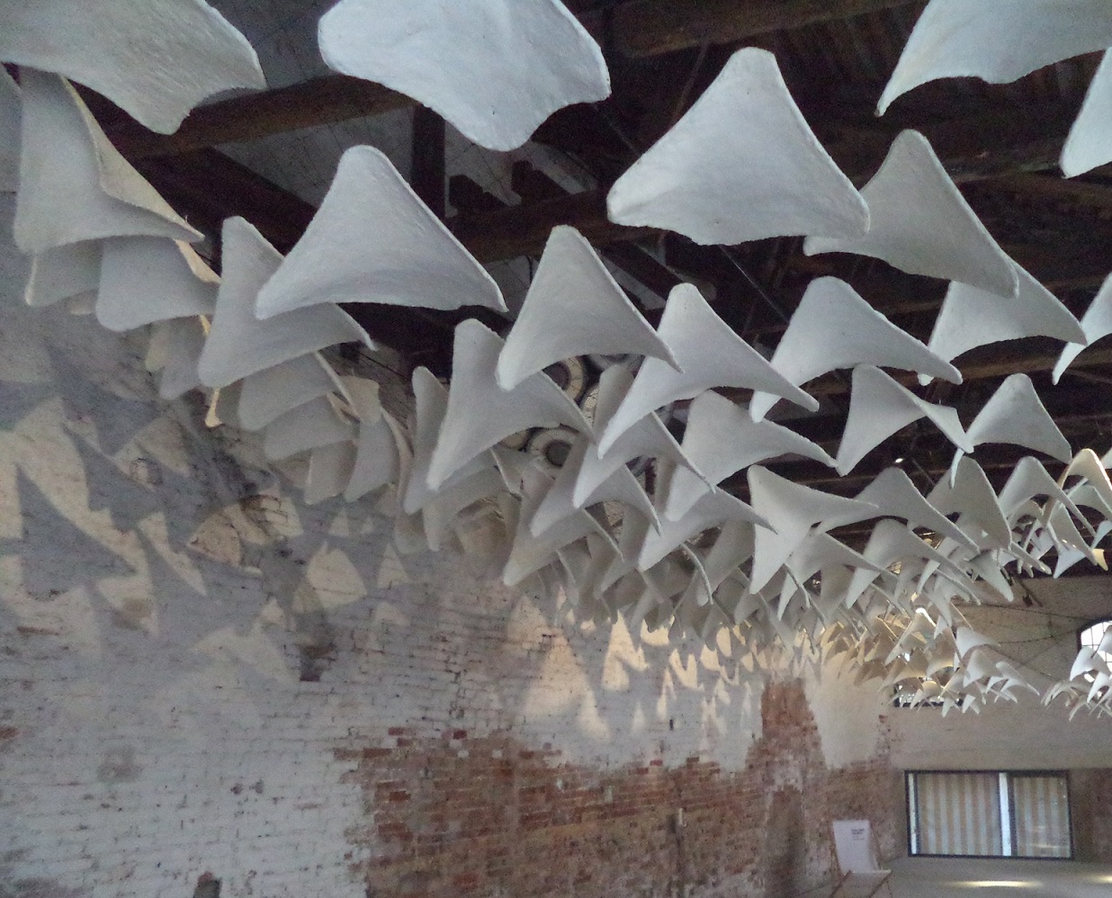 A Venezia, lo “sciame” bianco di triangoli smussati avrebbe le ife più ritmate che claudicanti. Quelli sono appesi al soffitto, conquistando la morbidezza delle nuvole, che non si percepisce spinosa, o comunque solleticante, trasfigurando il muschio. La forma che smussa il triangolo caratterizza il boomerang. La Natura “si vendica” da sola, se l’uomo contribuisce ad inquinare un ecosistema! Ma quanto il plettro fungerebbe da “bustina per l’infuso”, distorcendo rispetto ad un metronomo dal bruco alla farfalla, passando per la crisalide? In questa installazione, più che il vitalismo noi percepiamo il surrealismo, esteticamente. I funghi possono essere psichedelici, come la musica rock. Ovviamente la bioarchitettura assicura la “leggerezza” della sostenibilità. Le farfalle vivono poco; gli ambientalisti vorrebbero abbattere rapidamente gli ecomostri…