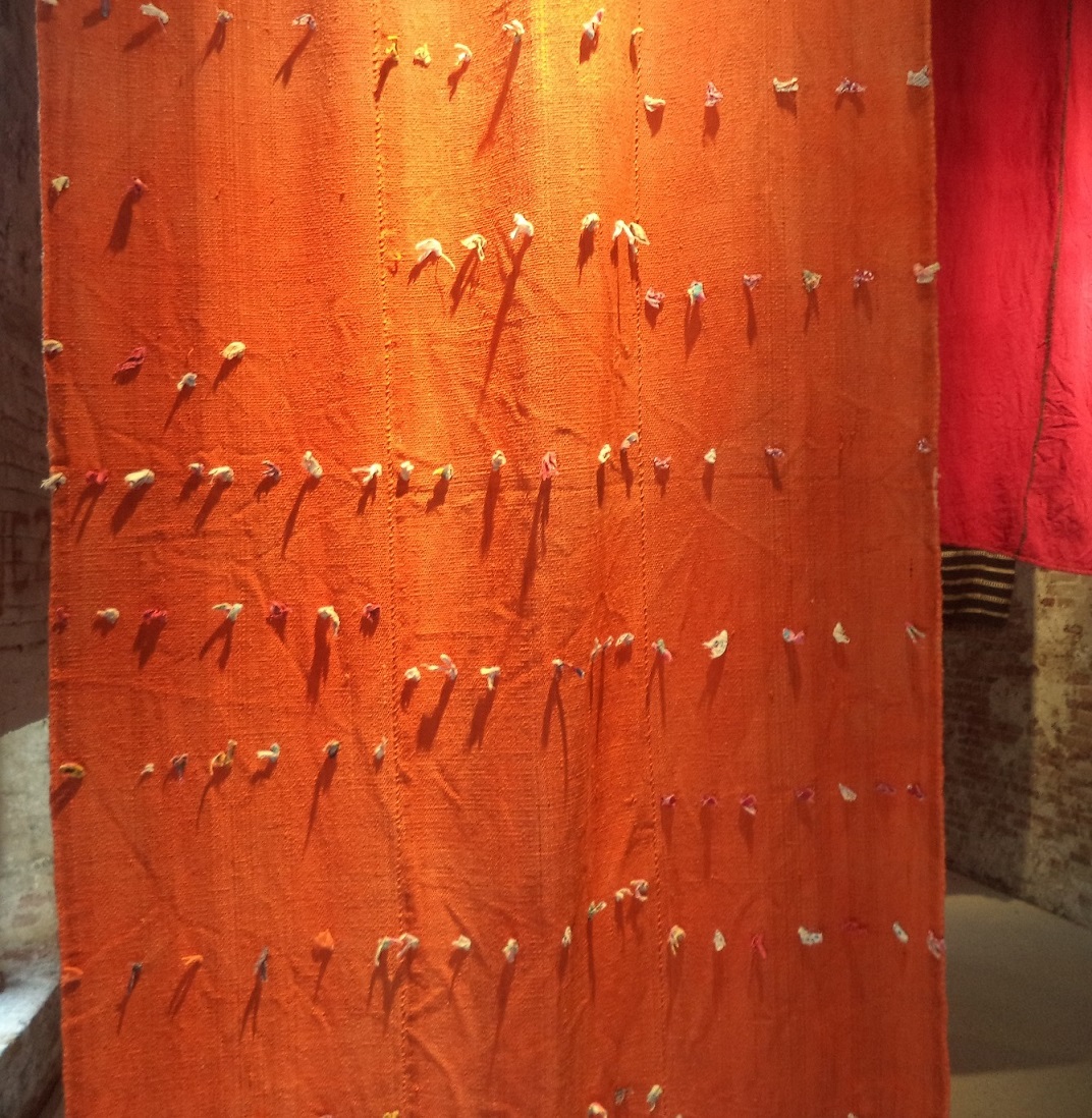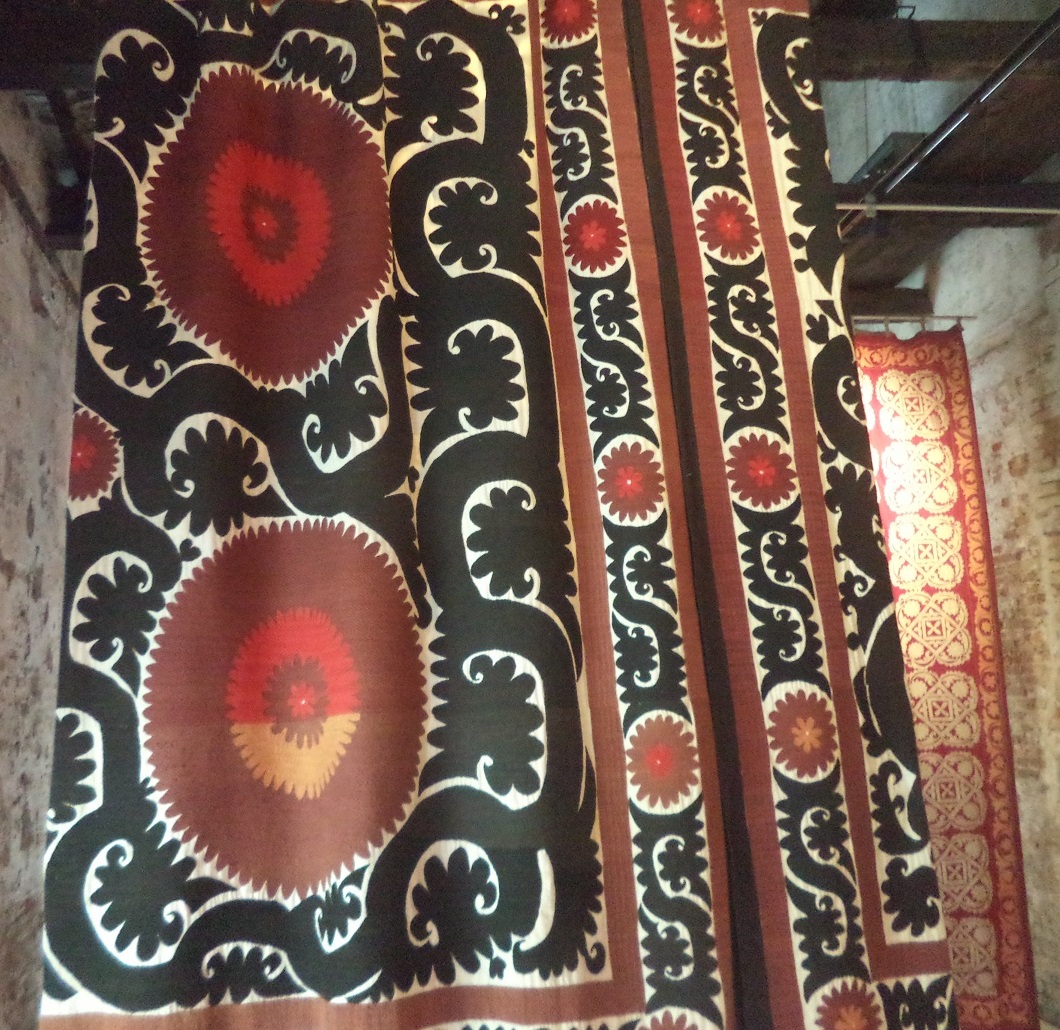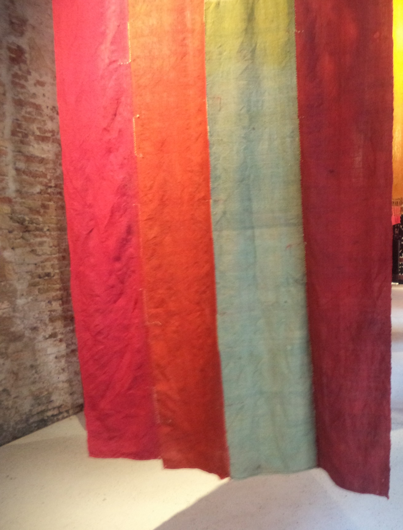 Il motivo del sole si percepirebbe più in fioritura che irradiando, all’aumento del vitalismo. La minuziosità dell’arabesco sarebbe esistenzialistica, se i legami ci influenzano. Noi possediamo i bronchi, come radici per la respirazione. Le nostre emozioni “si riscalderebbero per mettere in moto” un fogliame del diaframma, oltre una nuvola della gola. Il cantante lotta continuamente contro la secchezza della voce. L’arabesco al nero del pentagramma sarebbe “fungino”. La musica deve contagiare… In Africa esiste il baobab, perché i bisogni materialistici contino di più rispetto alle influenze spirituali; in Asia Centrale esiste la yurta, perché il nomadismo insegua le tessere d’un domino: dalle paratie per il canale meno prosciugato. Il sole rientra nei tarocchi. Il nomade dovrà indovinare il punto migliore per scavare il nuovo pozzo. L’allestimento scelto da Antje Schiffers per i tappeti e le coperte è pure al domino. L’acclimatazione interessa agli esploratori. A Venezia, il visitatore della mostra è virtualmente invitato a giocare da sbandieratore. L’effetto domino ha un valore pure ambientalista: stravolgendo un clima, i viventi dovranno riadattarsi. Lo sbandieratore alza simbolicamente le pareti d’una città. Così egli accoglierà il forestiero incuneatosi.