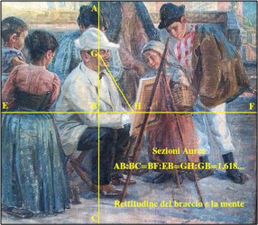 Ecco così era Kristian Zahrtmann e non altri. Apparentamente non poteva essere un vero “alchimista”. Meglio dire non poteva essere un “bugiardo pittore” che si cela in un rimpianto, con l’idea di poter rinascere da vero uomo solo con l’alchimia. Anche se il dipinto «Il Matrimonio mistico di Pistoia» che egli fece, si differenzia dal resto della sua produzione pittorica quasi smascherandosi, per intravedersi nel giovanotto eretto col pugnale, nell’intento della creazione umana iniziale e successiva da venire. Così era lo scopo del suo creatore ma poi, per necessità, dovette farli chinare come tutti coloro che assistevano nel rito del «Matrimonio mistico di Pistoia» e il fatto di Pistoia sembra un’isola lontana, lontanissima ─ mettiamo ─, dai dipinti del suo mondo di Civita d’Antino d’Abruzzo, il mondo degli “uomini eretti“. Infatti il Genius loci incorona Kristian Zahrtmann di incoronarlo con la sezione aurea. L’abbiamo visto in precedenza nelle due foto come un uomo nuovo della rettitudine del braccio e la mente.