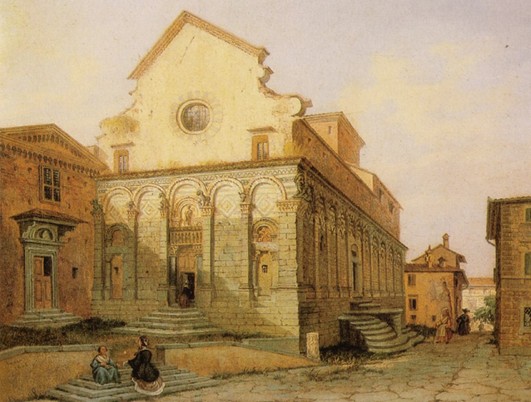 Il pittore danese Kristian Zahrtmann, che divenne maestro e riferimento per una generazione d’artisti ispirati alle esperienze del simbolismo europeo, giunse in Italia negli anni Ottanta dell’Ottocento attirato, come i tanti artisti dal fascino del ricco e allora inviolato patrimonio artistico dei centri minori italiani. Giunse a Pistoia, snodo ferroviario fondamentale dell’epoca e già nota nelle guide turistiche per la ricca dotazione di chiese e sculture medievali. Egli restò suggestionato dall’immagine della chiesa di San Pietro al punto di sceglierla come ambientazione di un dipinto di genere storico, che in una vendita all’asta del 1918 risultò il quadro più costoso della Danimarca.