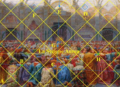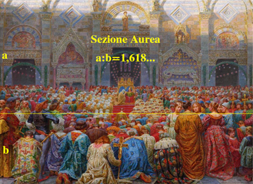 Kristian Zahrtmann ha ritratto fedelmente lo scenario del matrimonio davanti alla chiesa di San Pier Maggiore a Pistoia, così come lui l’ha immaginata, ma si nota visibilmente una divisione del quadro in due scenari chiaramente evidenti secondo la linea della Sezione Aurea. L’immagine del quadro ce li mostra.