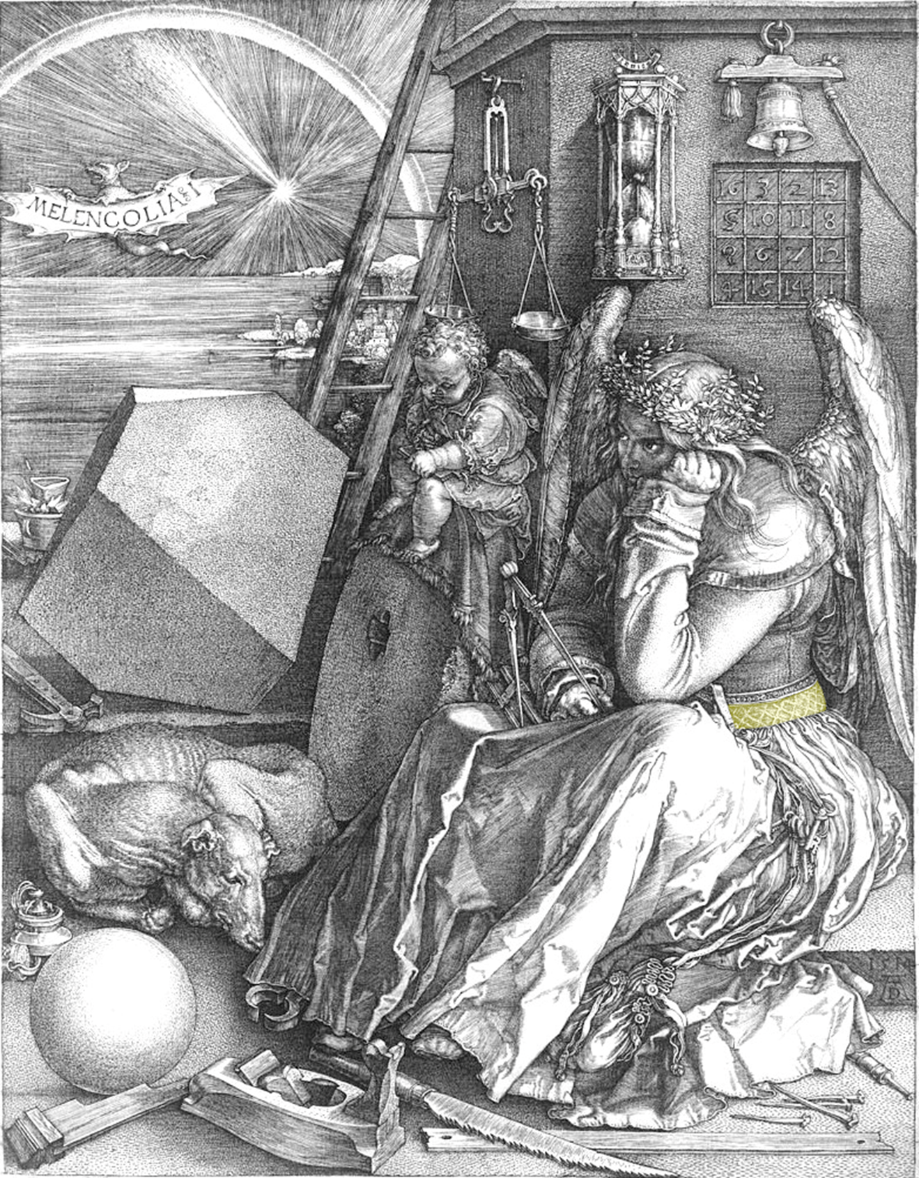 Un altro caso di opera pittorica che permette di accettare ermeticamente il concetto del sigillo di Hermes, Sale dei Saggi e altri nomi, è l’opera di Albrecht Dűrer, Melencolia I. Ho evidenziato nella figura di quest’opera, la cintura in discussione colorandola in giallo.