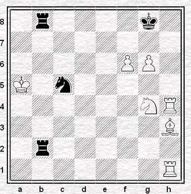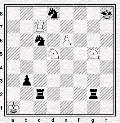 La posizione del Bianco sembra molto compromessa. Ogni parte sta attaccando un Cavallo, ma il più importante è che il Nero minaccia Matto. Il Bianco non ha difesa, per cui può solo contrattaccare, ma i Cavalli del Nero si oppongono a questo piano, finché un’idea brillante del Bianco li obbliga a cooperare col nemico (!)
