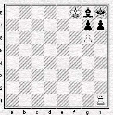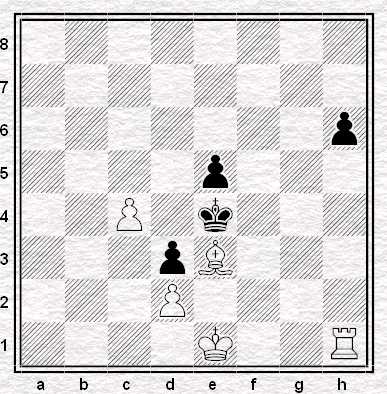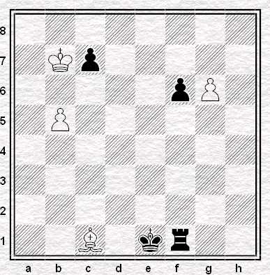 Il Pedone Passato in g6 può essere solo sostenuto dall’Alfiere bianco ed essere attaccato dalla Torre nera sulla colonna g, poiché l’azione della Torre sulla colonna f è ostacolata dal Pedone nero (ostruzione). Tuttavia, l’Alfiere è in grado di bloccare la colonna g facendo uso di vari motivi: con 1. Ae3 controlla la casa g1 e blocca la colonna g, per cui la Torre nera gioca: 1….Tf3. Dopo la mossa della Torre nera Il Bianco vince in ogni caso con 2. Ag5. Infatti, dopo 2…f6 x A, il Pedone ostruisce la colonna g, e se invece il Bianco gioca 2…Tg3 il Nero con 3. Ah4 inchioda la Torre. Il Pedone non può essere fermato.