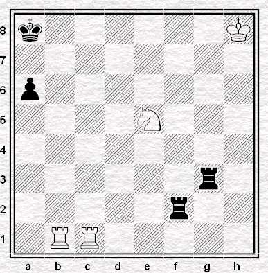 Soluzione: 1. Tc8+ Ra7 2. Tc7+ Ra8 3. Ta7+! Rxa7 4. Cc6+ Ra8 5. Tb8#. Notiamo che la presenza delle Torri nere in f2 e g3 è in realtà superflua, essendo state inserite solamente per preservare l’equilibrio materiale.