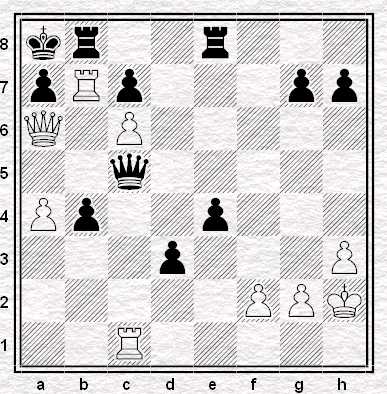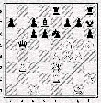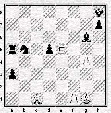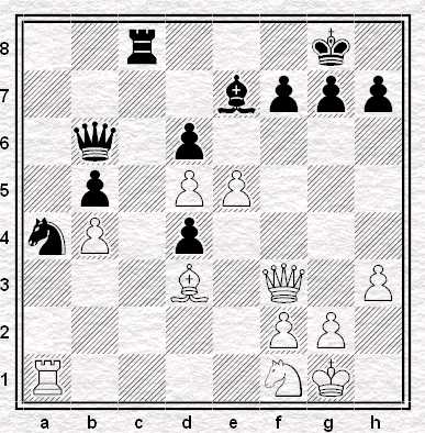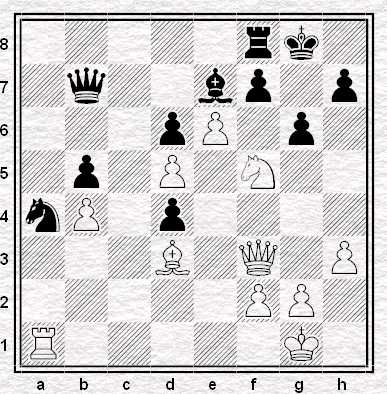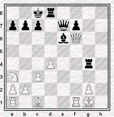 ”La mossa tocca al Nero, che ha un Cavallo ed un Pedone in meno, per cui deve vincere rapidamente, ammesso che ciò sia possibile. Il Nero gioca: 23…Td8-g8 24. Tf1-f2 (Se 24. DxD Txf2+ 25. Rh1 Ad5! e il Matto segue in poche mosse) Tg4xg2+ 25. Rg1-f1 Ae6-c4+ 26. Ca3xc4 Tg2-g1 Matto”