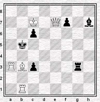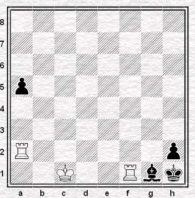 Soluzione: 1. Taf2! a4 (forzata) 2. Rd2!! a3 3. Ta1! a2 4. Re1!! Grazie a questa mossa, l’Alfiere nero può giocare e prendere la Tf2 con scacco, ma con 5. Rxf2 il Bianco da matto.