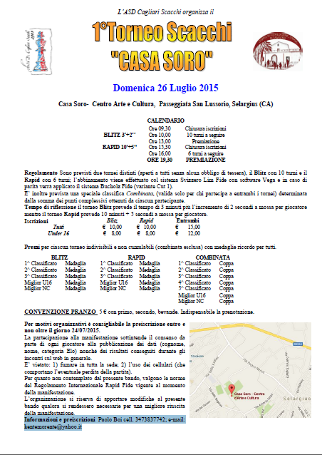 Con mio grande piacere segnalo l’iniziativa del mio vecchio compagno di circolo cagliaritano, Paolo Boi, insieme all’ASD Cagliari Scacchi. Il torneo ha una particolare struttura particolarmente interessante e non richiede la tessera. Per i dettagli, invito a scaricare il volantino. TORNEO CASA SORO 2015 rev1. Dal volantino inserisco anche a chi vi potete rivolgere nel caso foste interessati.