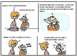 Dunque, posso dedurre che i miei genitori non padroneggiano la lingua come i miei nonni, e io non ho la stessa padronanza che invece hanno i miei genitori. E’ un circolo vizioso che va ad aggravarsi nelle generazioni più giovani: il Sardo è in serio pericolo di estinzione. Ormai la lingua italiana è sicuramente quella madre (L1), mentre il Sardo non occupa nemmeno il posto di quelle che si definiscono L2, cioè lingue apprese successivamente alla L1 in modo volontario. Si classifica invece come LE, lingua intermedia, il cui apprendimento viene lasciato al caso, senza creare volontariamente situazioni di studio mirato. Ecco perché si verifica in Sardegna una situazione di diglossia, dove due lingue presiedono nella stessa comunità, ma queste non sono alla pari. L’Italiano si definisce “high”, parlato e capito da tutti, mentre il Sardo è “low”, non parlato (se non con qualche sentenza di circostanza) e poco capito. L’ingresso dell’Italiano nelle scuole creò (e in alcuni paesi crea) un disorientamento generale dell’uso del Sardo: ciò facilita la nascita di vocaboli vistosamente spuri, quali ‘prestu’, ‘giallu’ etc.