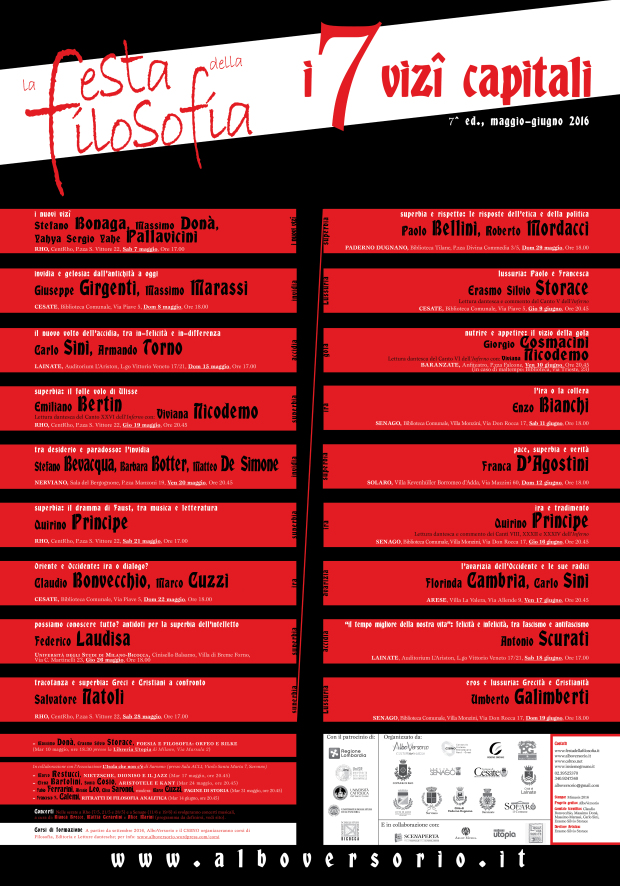 Siamo lieti di segnalare questa encomiabile iniziativa promossa dalla casa editrice Albo Versorio, che si occupa di pubblicazione ad alto valore scientifico e non soltanto, ed è anche una associazione culturale che vi invitiamo a scoprire in entrambe le vesti. L’iniziativa, dunque, promossa da Albo Versorio è “La festa della filosofia”, un appuntamento che si rinnova ormai da diversi anni. Qui sotto il poster del programma, mentre invito tutti i lettori di SF a guardare il sito dell’iniziativa per tutti i dettagli. Va segnalata la qualità e il dettaglio di questa iniziativa, che ben si mostra anche dal sito stesso, un fatto oggi tutt’altro che collaterale nonostante non sia ancora un concetto ben radicato nel nostro Paese. Un plauso, dunque, anche per questo. In fine, segnalo direttamente che Sonia Cosio (24 maggio 2016, ore 20,45 – SARONNO, SALA ACLI – vicolo Santa Marta, 7) Elena Bartolini e Sonia Cosio – ARISTOTELE E KANT), presenterà il suo libro, che abbiamo avuto modo di recensire nei nostri canali.