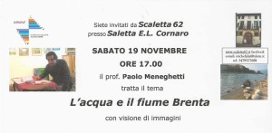 Il critico d’estetica contemporanea Paolo Meneghetti terrà una conferenza a voce (di circa 60 minuti), incentratasulla fenomenologia del Fiume Brenta. In particolare, egli citerà la percezione dell’acqua secondo il lirismo di più autori (fra cui Bachelard, Eluard, Heidegger, Carducci, Nancy).