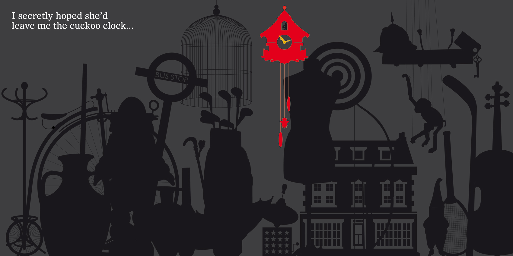 Nella soffitta stracolma di tesori, gli oggetti mantengono, per tutta la storia, una posizione inalterata. Tra i più svariati ritroviamo: l’orologio a cucù, il biciclo, le mazze da golf, fino ad arrivare ad una collezione di vasi. Man mano che il lettore prosegue con la lettura, nota come gli oggetti precedentemente citati scompaiano progressivamente, perché dati in eredità a qualche altro parente. I colori predominanti nell’albo sono il nero e il grigio, che evidentemente descrivono accuratamente l’ambiente soffitta, ma che inoltre mandano un richiamo al tema del lutto. Solo gli oggetti citati, prima di scomparire, sono in grado di spezzare tale monocromia con colori accesi quali rosso, giallo, viola, marrone e arancione. Tali oggetti colorati rappresentano le aspettative e le speranze del protagonista, le quali inizialmente potrebbero essere soddisfatte, ma successivamente è palese che siano destinate a deluderci (ovvero a scomparire fisicamente dalla soffitta). Questo elemento lo ritroviamo anche nel testo, dove le aspettative vengono scritte in bianco, colore che però scema e si trasforma in un grigio spento quando queste non vengono realizzate. Un primo esempio lo troviamo già nel titolo dell’albo, dove: “Nella soffitta”, oggetto reale e tangibile, rimane evidenziato rispetto a “di mia zia”, la quale ormai non c’è più.
