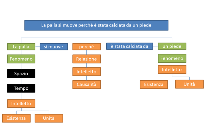 L’idea generale è, appunto, fornire una ricostruzione razionale delle condizioni generali delle nostre conoscenze ordinarie. L’esempio del calcio della palla può essere fruttuosamente tenuto a mente. Formulare la frase ‘la palla si è mossa grazie al calcio del piede che ha trasmesso movimento’ richiede, come visto, non solo l’immissione di dati di senso, forniti dall’intuizione spaziale e temporale, ma anche la costituzione di entità – fenomeni come la palla e il piede – riuniti in relazione – causale, in questo caso. I dati dell’esperienza sono fondati sulle intuizioni di spazio e tempo, senso esterno e senso interno che danno l’idea che la palla ha una sua dimensione che si sposta dopo che il piede ha dato il calcio. Per vedere (in parte) la complessa interazione tra le varie parti della mente umana in questo semplice esempio riportiamo un diagramma: