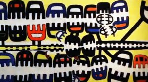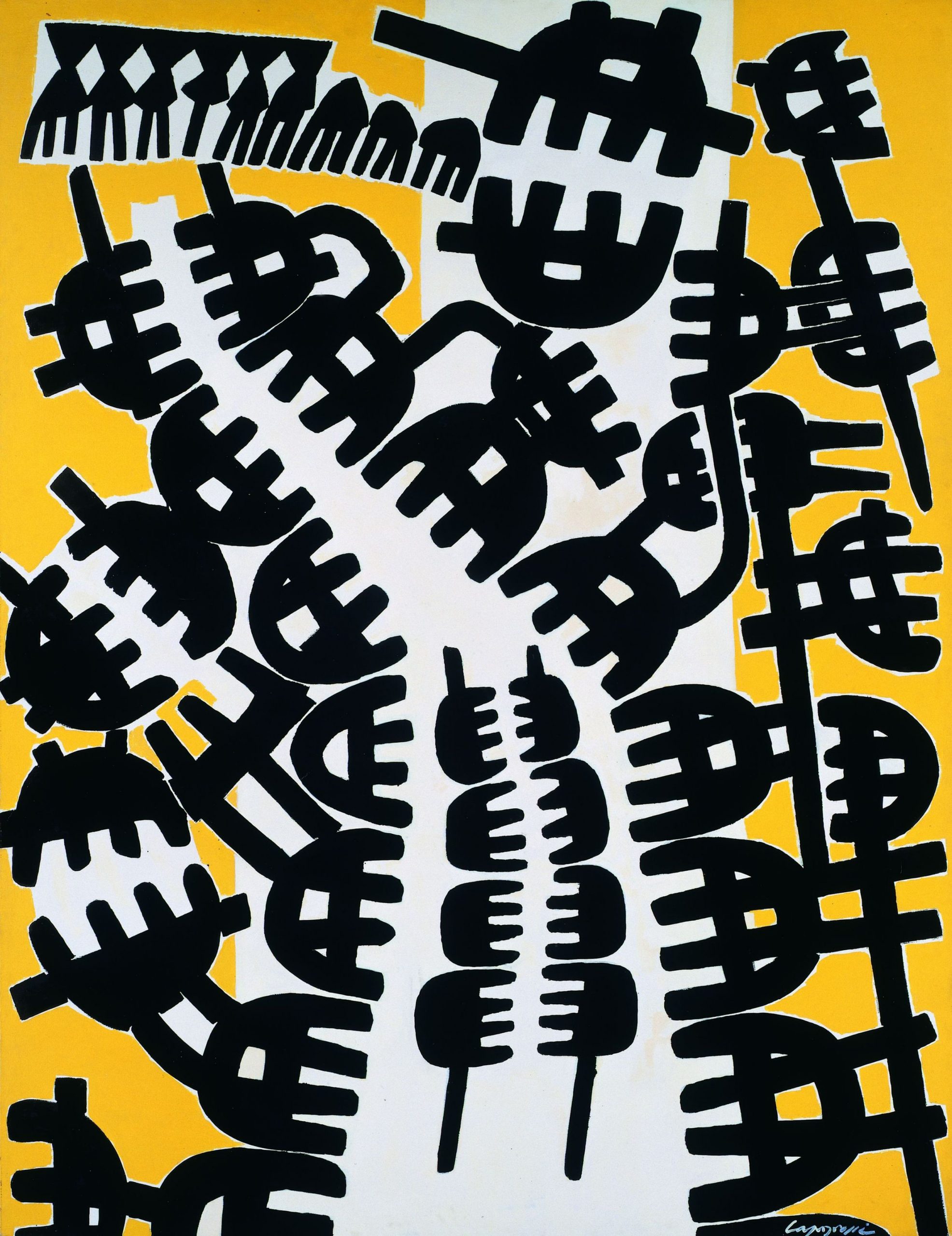 Nel quadro Ballo sul fiume, un gonfalone bianco si vede “dentellato”. Capogrossi narra che da bambino, all’età di dieci anni, si recò con la madre in un istituto per ciechi. In quel momento, lui ebbe l’intuizione del tetradente. Alcuni bambini disegnavano più linee “vivaci”, di colore nero. Naturalmente, quelle non rimandavano a figure reali (impossibili da conoscere, per il cieco). Capogrossi però aveva capito che pure l’interiorità era disegnabile. Quando nel 1949 lui espone il primo tetradente, questo si percepisce in maniera essenzialmente geroglifica. La forma basilare “a pettine” dovrebbe pungere, e tuttavia il tratto è ampio, per cui lo vediamo “appesantito”, cercando la stabilizzazione. Inoltre, il tetradente ha nel “manico” la “gobba”. Conosciamo le scritture rupestri, agli albori della civiltà. In quelle, spesso si cerca di rappresentare una scena di caccia. Guardato con le punte per terra, e la “gobba” in alto, sembra che il tetradente si configuri come la miniatura d’un “tozzo animale”: forse un elefante, una mucca od un cavallo. Capogrossi andrà “a caccia” della sua interiorità. Guardando la “gobba”, sempre si parte da un primo punto “a terra” per trovarne un altro. Lì, avremo la percezione d’uno scavo. Con la “gobba”, letteralmente si alzerà un po’ di terra per poi lasciare che questa sprofondi. Qualcosa di simile accadrà nell’interiorità. Questa “s’alzerebbe”, tramite le più intense emozioni, salvo poi “sprofondare” nei sentimenti (i quali tendono a trapassare, ossia a perdurare nello “svanimento” della loro immediatezza). E’ così ammissibile che la gobba visivamente simboleggi l’interiorità. Qualcuno percepirà che la “dentatura” possa calamitare. Mediante la “gobba”, inizialmente il tratto dovrà uscire verso di noi (per i nostri sguardi). Esso però alla fine sprofonderà nel quadro. La linea curva della gobba potrebbe segnalarci il limite d’un campo magnetico. Su questo, cadrebbe il nostro sguardo, dopo aver seguito i denti. Percepiti in maniera “magnetica”, i dipinti di Capogrossi parranno d’una “materialità interiore”. Il nostro sguardo letteralmente finirà per “attaccarsi” alla “profondità” di se stesso. Noi conosciamo la materialità mediante i sensi. Questi ci attaccano al mondo. Per Capogrossi, il tetradente si farà dipingere non rappresentando nulla di materiale. Il nostro sguardo sarà calamitato, ovvero attaccato verso la profondità (od “interiorità”) di sé. In via percettiva, ci sembra un accentramento. L’attaccarsi fra due enti ne mantiene una delimitazione: anche per questo, lo pensiamo nel materialismo dei sensi. Invece, nell’interiorità bisogna accentrarsi. Capogrossi dipinge quattro denti, come classicamente gli elementi naturali (l’acqua, la terra, il fuoco, l’aria). La “gobba” ci consente d’interiorizzarli nel loro insieme, quindi da accentrati. Per Capogrossi, la sua pittura mostrava lo spazio dove nascono sia le opinioni sia le azioni dell’uomo. Se il tetradente rientrasse nel geroglifico, lì avremmo un background estetico più vicino all’oralità che all’alfabetismo. Pure il grande critico d’arte Giulio Carlo Argan studiò la pittura di Capogrossi. Per lui, il tetradente andrebbe percepito tramite l’orizzonte della “curva” ed i piani del vissuto sulle punte. Complessivamente, tale figura cercherebbe di possedere lo spazio pittorico, con la perentorietà del “timbro”. Argan pensa che il tetradente si percepisca in via magnetica. Una timbratura accade sempre con forza ed immediatezza. I quadri avrebbero pure un loro campo magnetico. Ad esempio, spesso avviene che i numerosi tetradenti si collochino l’uno di fronte all’altro, così da allacciarsi sulle punte. Se visti in successione verticale, li percepiremo in figura quasi “elicoidale”. Sembra che torni il simbolismo dell’interiorità. In biologia, conosciamo la struttura a doppia elica del DNA. Essa ha le basi azotate dell’adenina, della timina, della citosina e della guanina: quattro in tutto, come nel “pettine” di Capogrossi. Il DNA identifica il livello materialmente “più interiore” della vita. Per Argan, i vari tetradenti messi in fila giungeranno a fluttuare, mediante alcune catene attanagliate. Nell’immagine del DNA a doppia elica, si vede qualcosa di simile. Se Argan reputa che il tetradente virtualmente si timbri sulla tela, per noi sarebbe più interessante percepirlo in via orale, come se quello “ci parlasse”. La figura geroglifica in tutti i casi rientra nella civiltà della scrittura. Il tetradente di Capogrossi avrebbe letteralmente un “timbro vocale”. I suoi dipinti “ci parlerebbero” dell’interiorità. La voce proviene dalla laringe, e noi non possiamo vedere né la prima né la seconda. Nei dipinti di Capogrossi, i “denti” del “pettine” saranno da immaginare entro una sorta di “bocca” per l’interiorità.