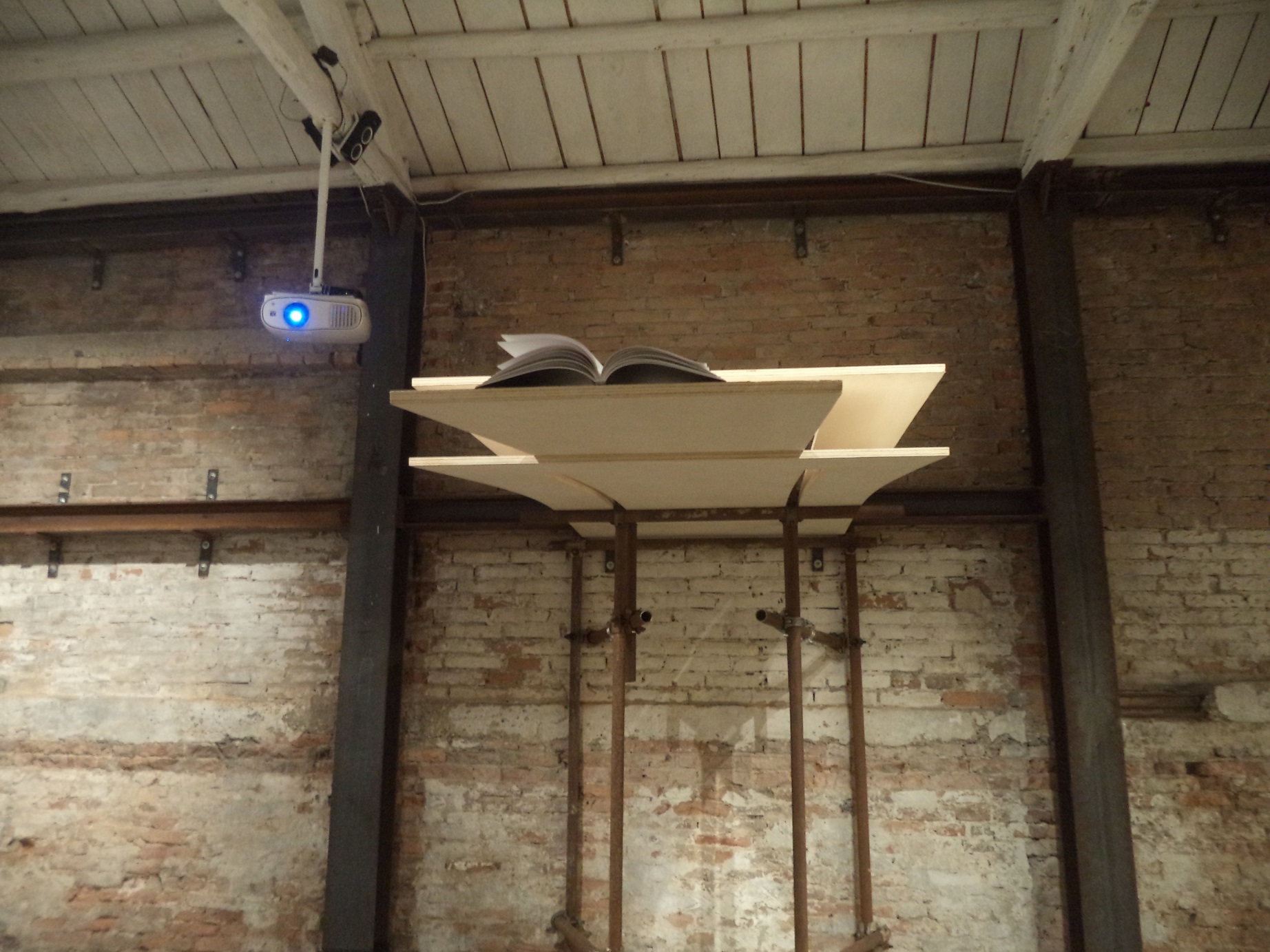 L’installazione di Luciana Lamothe s’intitola Plan. Un’impalcatura alquanto grezza, avendo i tubi non del tutto allacciati fra di loro, “cede” paradossalmente ad un rinforzo, grazie ad una pedana superiore, dalle fibre di legno. Simbolicamente, bisogna chiedersi quanto si può diventare flessibili, rispetto ad una pianificazione iniziale. Anzi, di fronte ai “misteri” dell’Universo, il caso fortuito d’una semplice decifrazione costituirebbe già un successo! La pedana favorisce il “salto” della pre-comprensione socioculturale. Bisogna “smontare le gabbie” del concettualismo, e per “librarsi” in una “lettura” degli eventi. Senza la naturalezza indeterminata d’una curiosità, lo stesso scienziato non può scoprire nulla… Serve un “occhio” allenato a percepire il “flusso” degli eventi. Le leggi della fisica trasformano costantemente l’immediatezza della realtà. Potenzialmente la nostra vita è un libro aperto. Per esperire il mondo, ne “leggeremo” gli accadimenti. La pedana permette di “sfogliare” il salto. Dal canto suo, col tuffo si vorrebbe una “leggiadria” per l’immersione, dialetticamente. La forza di gravità sarà derivata da un orizzonte “scandito”. All’estremità del “trampolino”, prima del “tuffo” verso l’ignoto, appare un libro. Per via delle pagine sfogliate, percepiremo un binocolo. Ovviamente “ci si immerge” nella rilassatezza d’una lettura. Il rinforzo della pedana è prospettico. Si proverà a decifrare il “mare” di frammenti cartacei sui quali Enrique Ramirez ha imbastito la sua contemplazione dello Spazio, e da una videoinstallazione. Questa si chiama La gravedad.