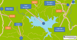 Il lago Mulargia è un lago artificiale posto nel centro della Sardegna e suddiviso territorialmente fra i paesi di Siurgus Donigala, Nurri, Goni e Orroli. L’unico lago non artificiale in Sardegna è il modesto lago Baratz, vicino ad Alghero, che con una profondità media di 5 metri e una grandezza più simile a quella di una laguna, non è assimilabile di certo all’importanza degli altri invasi sardi, come il Coghinas, l’Omodeo, il lago dell’alto Flumendosa e il suddetto lago Mulargia, tutti però non bacini naturali.